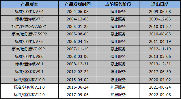 备注1:上述列出了KIS各个产品版本的产品生命周期