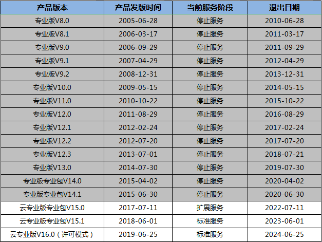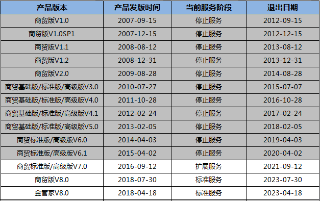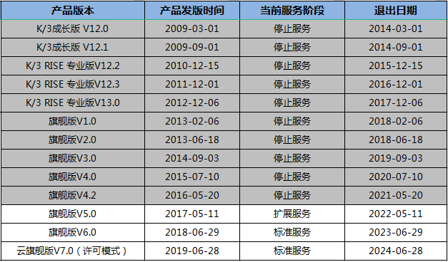 1) 退出生命周期后,金蝶客户服务中心及研发团队不再提供包括热线服务、版本升级、版本更新、需求反馈等相关服务。您将面临无法应用新技术、不适应法律法规调整、业务中断无法修复等风险,且产品更换将承担更多费用。