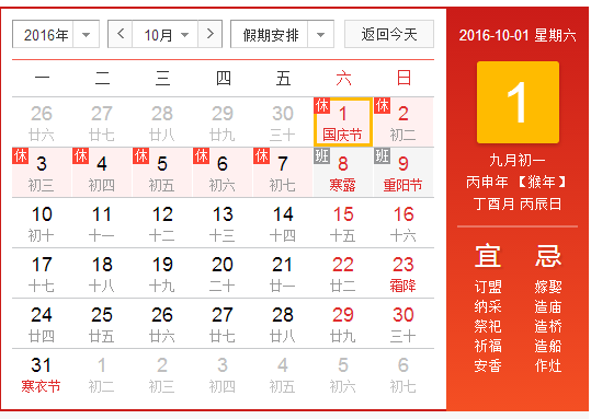 2016年10月1日至10月7日放假调休,共7天。10月8日(星期六)、10月9日(星期日)上班。